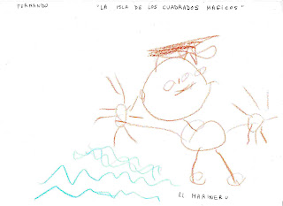 Nos han contado la historia de la ciudad de los cuadrados mágicos y hemos dibujado el cuento, sin ver todavía los cuadros del pintor, así lo hemos dibujado.